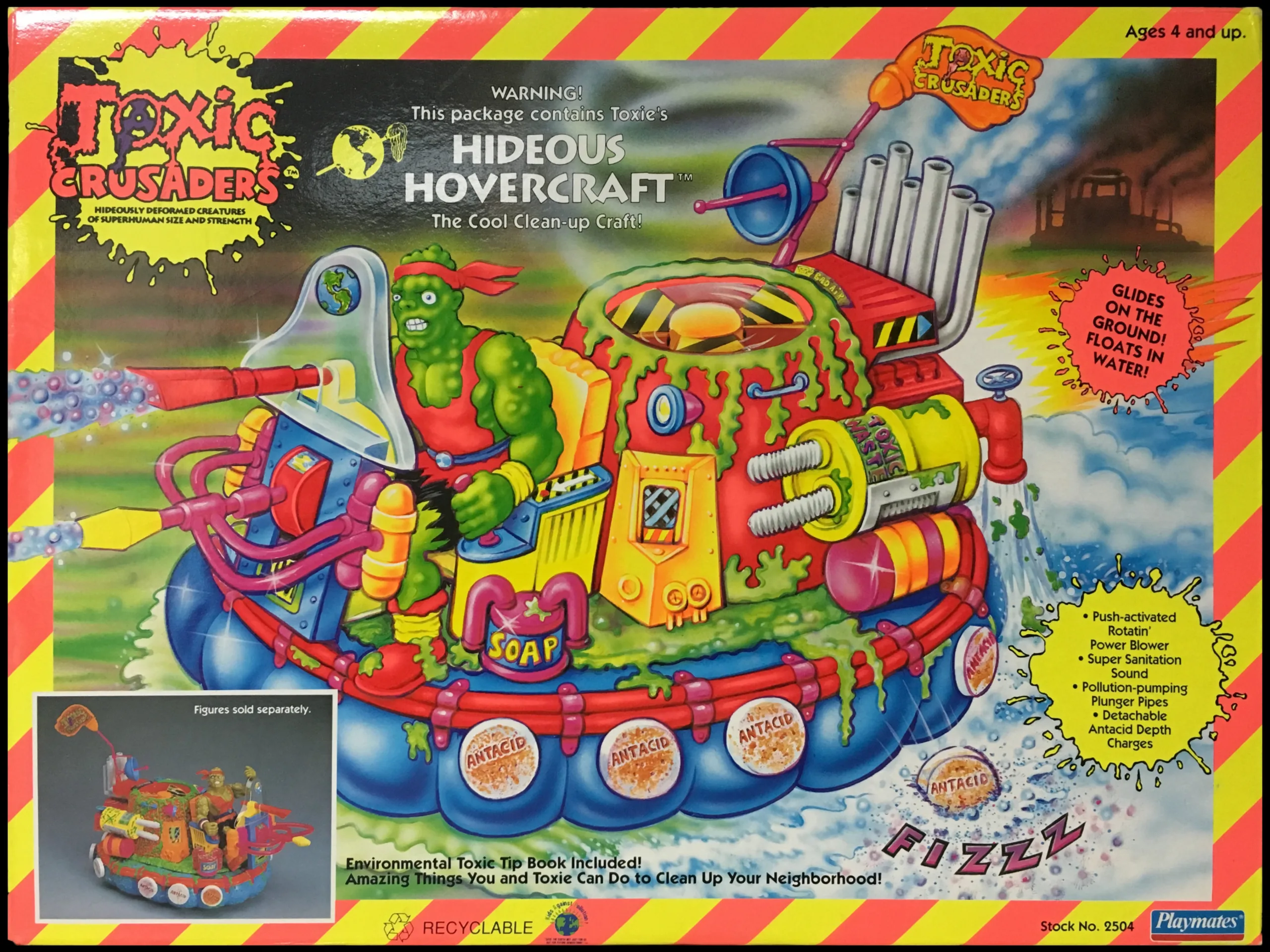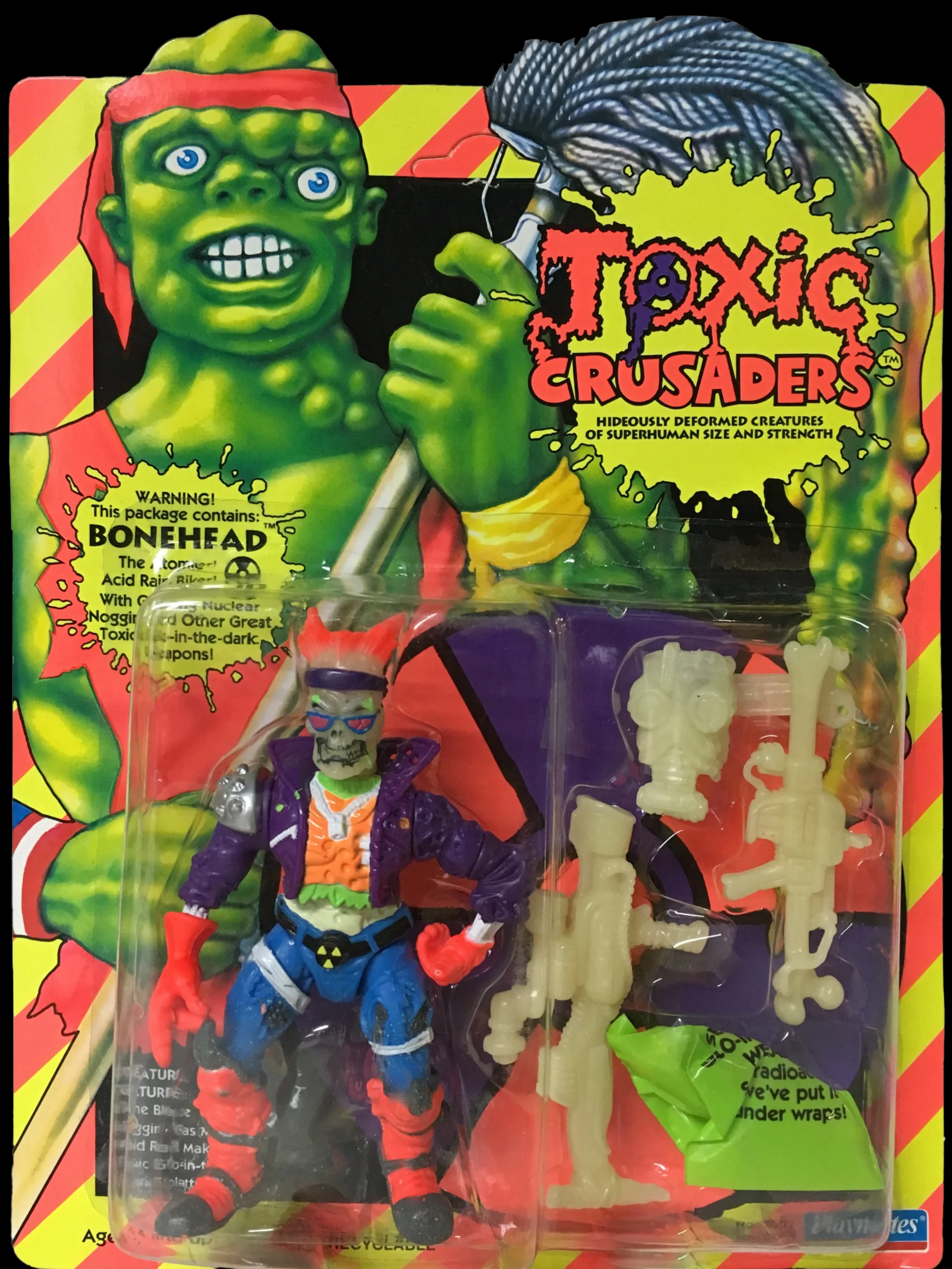 Playmates Toys first produced the Toxic Crusaders toys in 1991. There were several action figures and vehicles that launched in this collection. Bonehead, Headbanger, Dr. Killemoff, Junkyard, and Major Disaster are a few of the most popular action figures in this line. Apocalypse Attackcopter, Crusader Skater, Hideous Hovercraft, Smogcycle, and Toxic Turf Surfer are the vehicles.