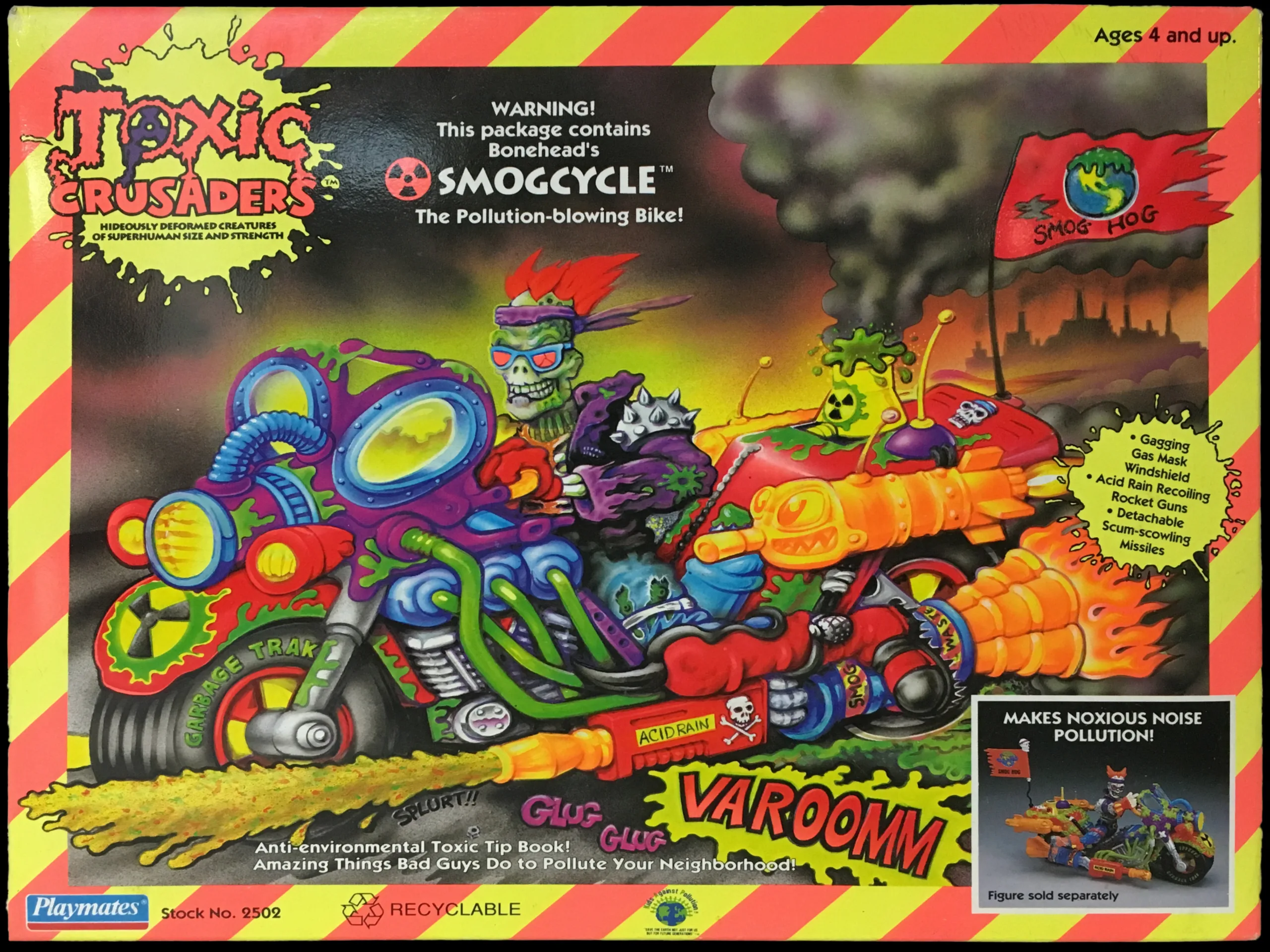 Playmates Toys first produced the Toxic Crusaders toys in 1991. There were several action figures and vehicles that launched in this collection. Bonehead, Headbanger, Dr. Killemoff, Junkyard, and Major Disaster are a few of the most popular action figures in this line. Apocalypse Attackcopter, Crusader Skater, Hideous Hovercraft, Smogcycle, and Toxic Turf Surfer are the vehicles.